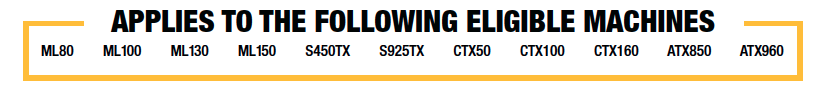 • Eligible machine models include: ML80, ML100, ML130, ML150, ATX850, ATX960, S450TX, S925TX, CTX50, CTX100, CTX160.